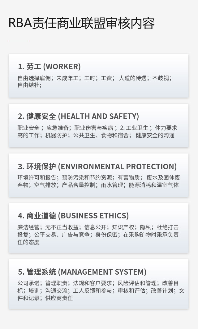 责任商业联盟行为准则(RBA)最初由多家电子产品制造公司于2004年6月至10月期间制定,最初名为EICC(即电子行业公民联盟)。目前为修订版7.0,于2021年1月正式发布和生效。旨在建立各种标准, 以确保电子行业或以电子产品为关键要素的行业、汽车零配件、玩具行业及其供应链的工作环境安全, 员工受到尊重并享有尊严, 且经营活动符合环保和道德要求。