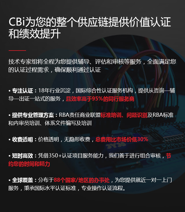 国际知名供应链品牌服务商,致力于提供全球领先的专业服务。业务范围涵盖认证、验厂、法规咨询、培训和贸易撮合等,在全球拥有150多个分支机构,服务客户超过45000家,其中包括雀巢、强生、澳柯玛、胜利油田、欧莱雅、荷兰国际集团银行等跨国企业。CBI凭借全球化技术优势和本地化服务理念,携手菁英国际专家团队,随时随地为您提供专业的业务解决方案,成就您企业的价值,帮助企业降低风险、简化流程、提升可持续发展竞争力。